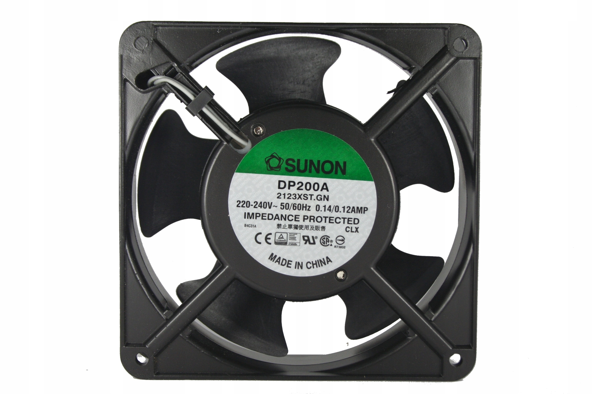 Вентилятор Sunon DP200A — это осевой вентилятор переменного тока с номинальным напряжением 220-240 В, частотой 50-60 Гц и потребляемым током 0.12-0.14 А. Размеры вентилятора составляют 120x120x38 мм. Он оснащён шариковым или скользящим подшипником (в зависимости от модификации), имеет скорость вращения около 2700-3150 об/мин и воздушный поток примерно 3.3 м³/мин. Мощность прибора около 21-22 Вт. Вентилятор обладает низким уровнем шума в диапазоне 44-50 дБ и может эксплуатироваться в температурном диапазоне от -10 до +70 °C. Корпус чаще выполнен из алюминия, что обеспечивает прочность и долговечность устройства. Применяется для охлаждения серверов, электрощитов, сварочного оборудования и биткоин-ферм, эффективно отводя избыточное тепло и поддерживая рабочую температуру техники.